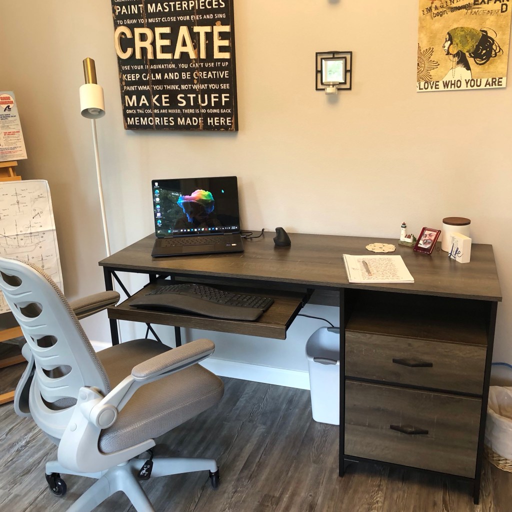 Of course a good desk is not the only tool a writer needs. Check out the other things I had to change out. The first was an ergonomic chair. Originally I had refinished an old dining room chair I had found at the Salvation Army store. I painted and upholstered it to match the desk, but it wasn’t comfortable for long periods of sitting, and it had no wheels. Next was the ergonomic keyboard, made to keep wrists in the correct position to prevent carpal tunnel and great after breaking my wrist.
