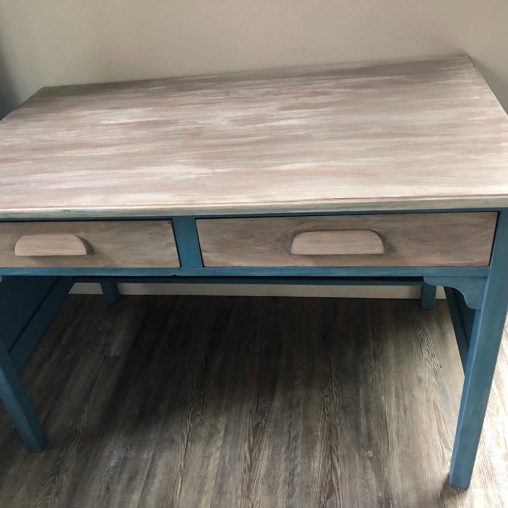 Emphasis on the old. I purchased this about two years ago. It was a solid navy color and I wanted a project to refinish for our home we were building at the beach. But, aesthetics aren’t as important as function. That was a hard pill for me to swallow. I love the way it turned out and I will be sad to sell it, but it proved to be the wrong desk for writing. Sure it was fine for longhand, but not for typing on a keyboard.